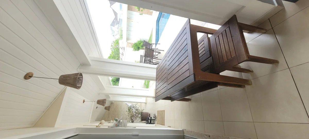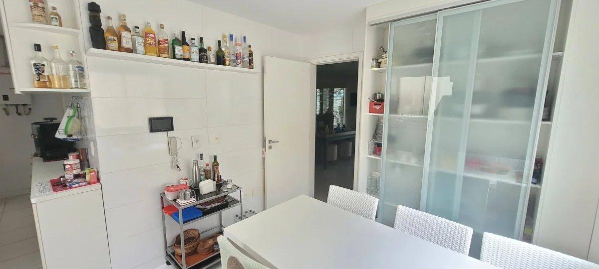 A cozinha, totalmente planejada e com muito espaço para armazenamento, dá acesso à dependência de empregada com banheiro (vista para o jardim), ao lavabo e à sala de jantar, que é integrada à sala de estar.
