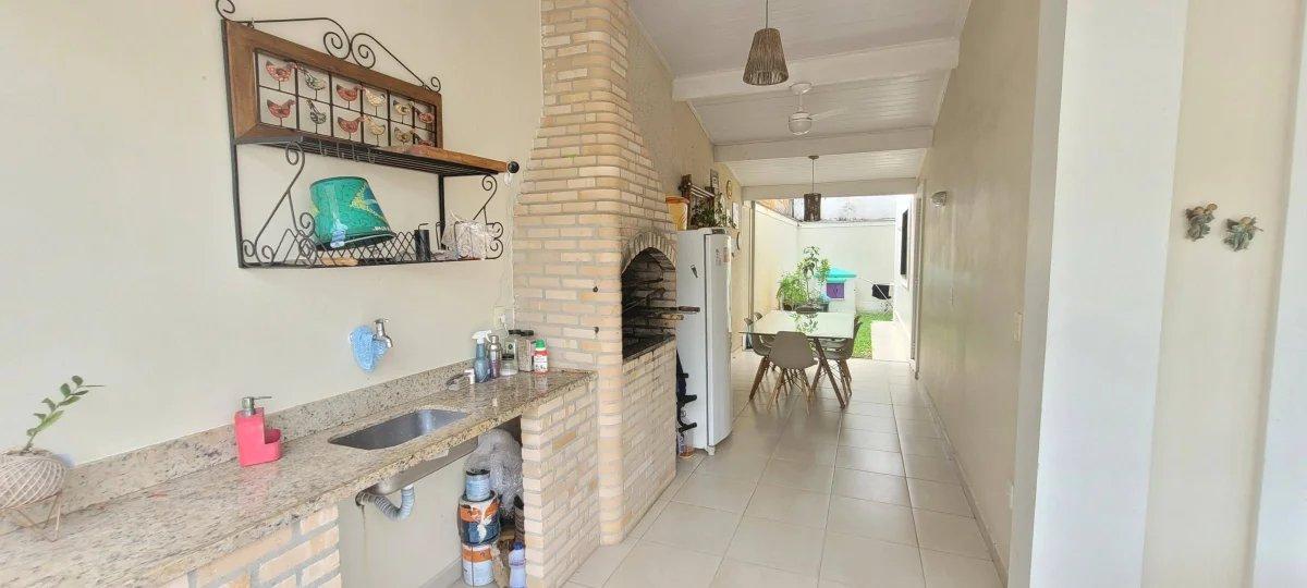 A casa possui quintal em todo o entorno, sendo o frontal com piscina e ampla varanda. Nas laterais, área gourmet e jardim. E, na área de fundos, lavanderia e acesso à cozinha.